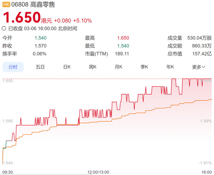 高鑫零售上个交易日港股上涨5.1%,最新市值157亿港元。