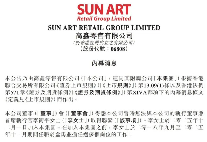 3月8日,大润发母公司高鑫零售(06808)公告称,鉴于李卫平女士至今仍未能取得联络,其于一段长时间内在未请假情况下,未能履行其职责,董事会已议决免除李女士作为本公司执行董事之职务,自3月8日起即时生效。董事会主席华裕能已获委任为本公司首席执行官、由非执行董事调任为执行董事,并获委任为本公司之授权代表,自3月8日起生效。